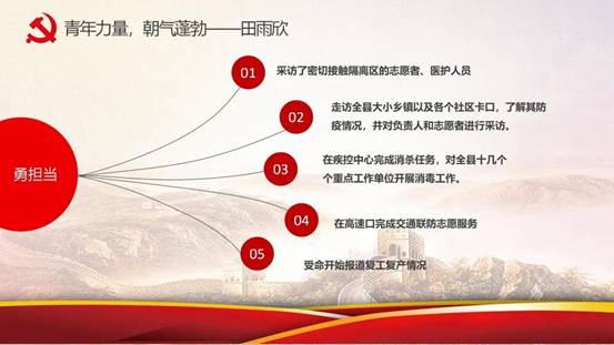 在抗击疫情期间,我院也涌现出了许多优秀青年。天津城建大学环境与市政工程学院17级环境工程1班学生田雨欣,在看到山西省晋城市陵川县红十字会发布的招募疫情防控志愿者的公告时,立即报名,以新闻志愿报道者的身份参与到疫情防控工作中去。在担任志愿者期间,田雨欣同学采访了密切接触隔离区的志愿者、医护人员,并走访全县大小乡镇以及各个社区卡口,了解其防疫情况,并对负责人和志愿者进行采访。田雨欣同学说:“这是真正的抗疫一线,采访结束后都要进行全身的消毒,心里很忐忑,担心会有感染的风险,但是一想到能为抗疫工作贡献出一份力量,涌上心头的更多是荣誉和光荣感。”