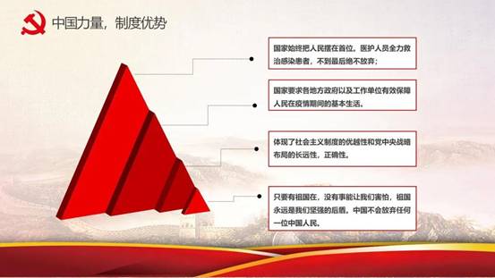 在抗击疫情期间,国家始终把人民摆在首位。医护人员全力救治感染患者,不到最后绝不放弃;因为疫情期间不能出门,国家要求各地方政府以及工作单位有效保障人民在疫情期间的基本生活。反观一些海外国家,在抗击疫情的关键时期却乱像层出不穷,更加体现了社会主义制度的优越性和党中央战略布局的长远性,正确性。这更加让我觉得,只要有祖国在,没有事能让我们害怕,祖国永远是我们坚强的后盾。中国不会放弃任何一位中国人民。