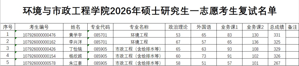 环境与市政工程学院2026年硕士研究生一志愿考生复试名单
